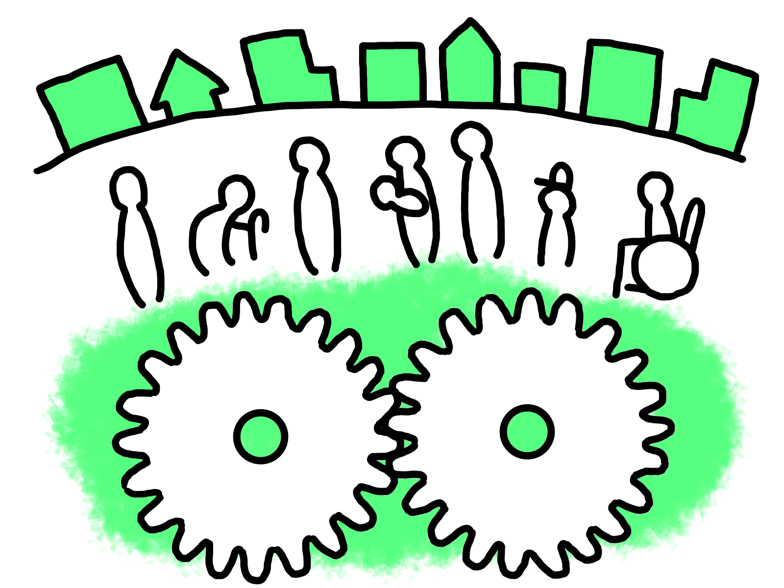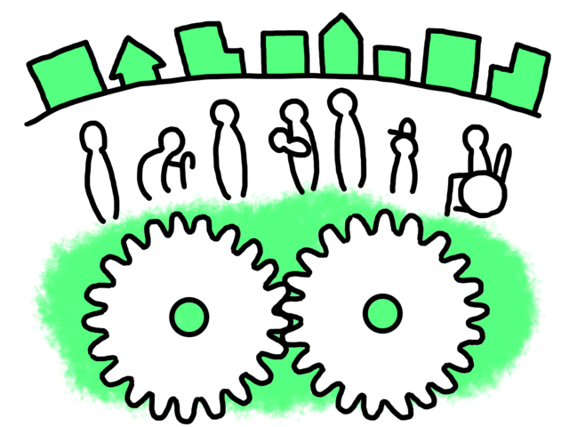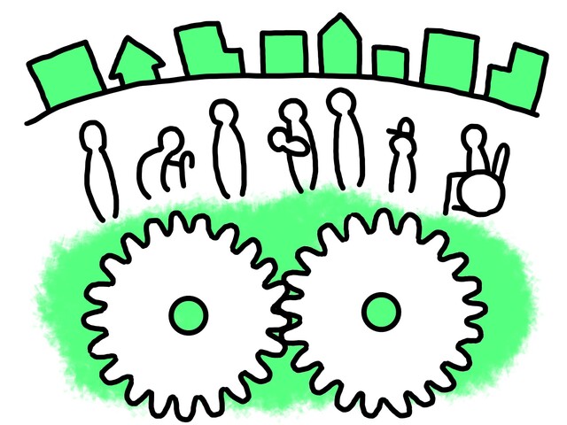 illustration material:中学校社会科公民的分野・国民の義務・かみあっているふたつの歯車と社会と人々・ふたつの歯車にはなにが入るのか空いた部分に自由に書き込めます/カラー(Citizen’s duty image/color)